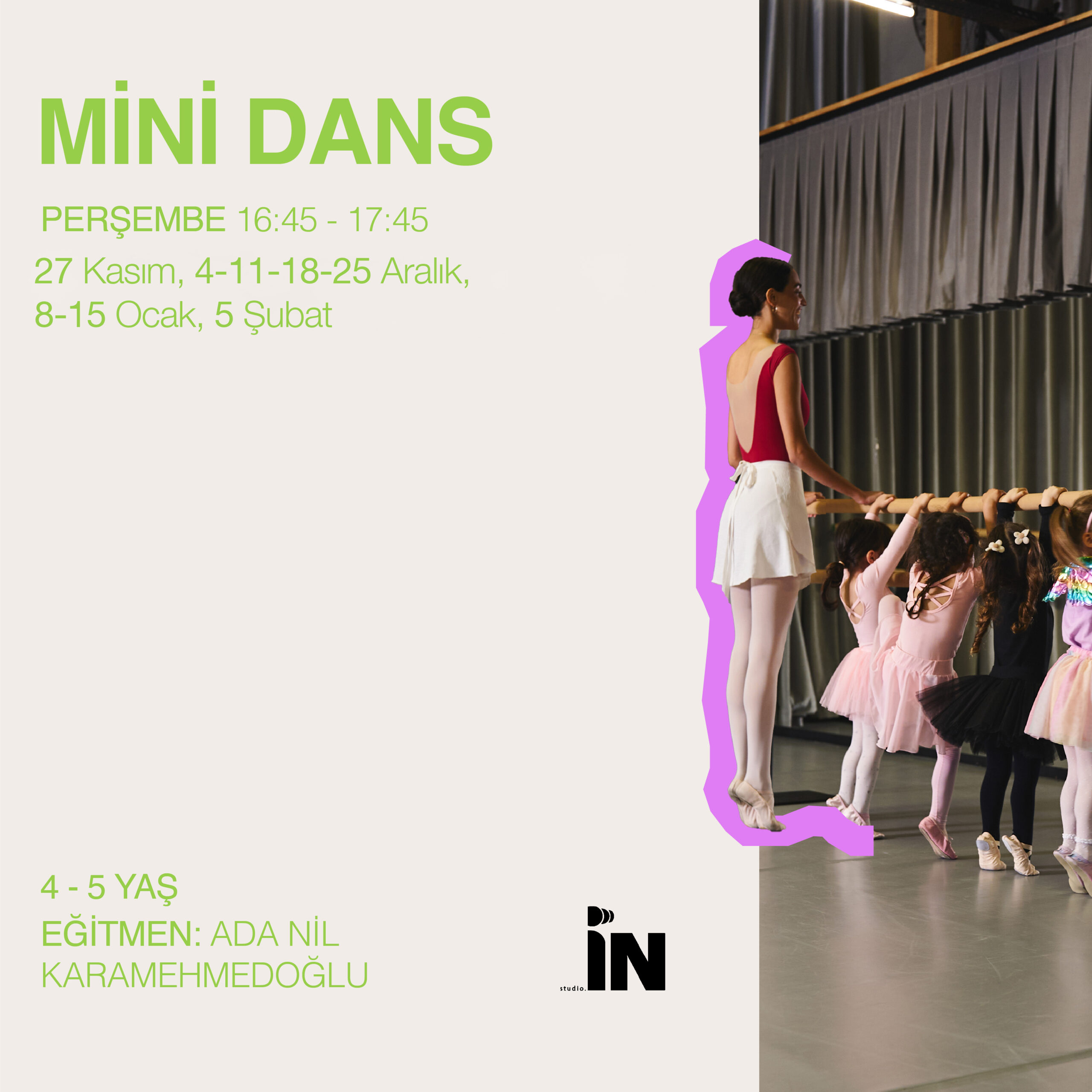 Eğitmenimiz Ada Nil Karamehmedoğlu liderliğinde, dans etme hayalini müzik eşliğinde, mini kombinasyonlar, doğaçlama ve ritmik deneyimlerle gerçekleştirecek mini dans – bale atölyemizde, her Perşembe dansın büyülü dünyasına adım atıyoruz.